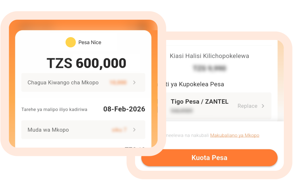 Baada ya kuthibitishwa, mkopo unahamishiwa kwa haraka kwenye pochi ya simu za mkononi kama M-Pesa, Airtel Money na njia kuu zingine, kuhakikisha fedha zinapatikana kwa sekunde chache kwa usalama wa kudumu.